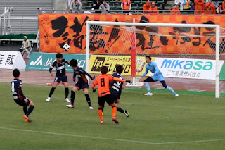 山口DF16瀬川選手のクロス、山口MF24山下選手の頭上 |