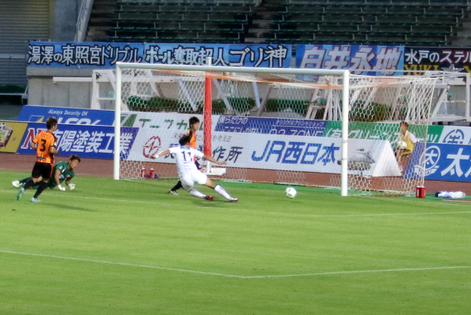 水戸♯26MF佐藤(和)選手のシュート、右ポストを直撃しゴールライン外へ |